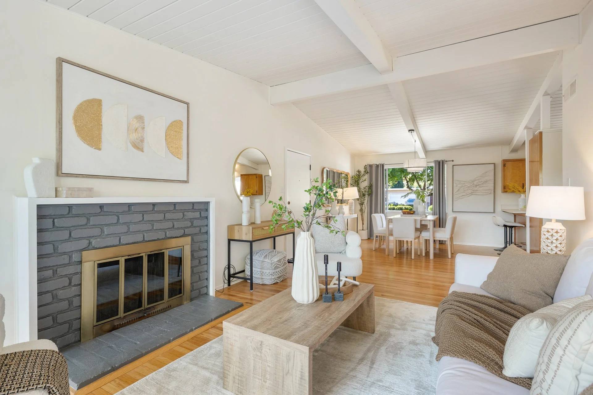 The open and airy floor plan showcases high beamed ceilings and large windows that fill the home with natural light throughout the day. The spacious living room includes a cozy fireplace, a large sliding glass door leading to the outdoor space, and a formal dining area conveniently located next to the kitchen - perfect for everyday living and entertaining.This lovely home offers three bedrooms, two bathrooms, and a two-car attached garage. All bedrooms are ideally situated toward the back of the home for added privacy. The primary suite enjoys direct access to the peaceful backyard, while the second bedroom overlooks the lush garden.